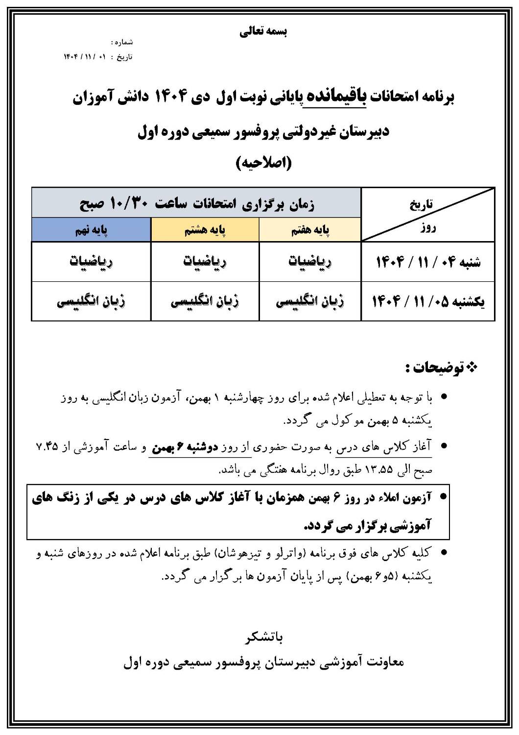لازم به ذکر است که دانش آموزان پایه هفتم و هشتم و نهم دبیرستان پروفسور سمیعی چهارشنبه 23 دی (طبق برنام اعلامی قبلی) آزمون ادبیات فارسی و دانش آموزان مقطع دهم آزمون عربی ، یازدهم آزمون دین و زندگی  و دوازدهم آزمون ادبیات فارسی  (طبق برنامه قبلی) خواهند داشت.