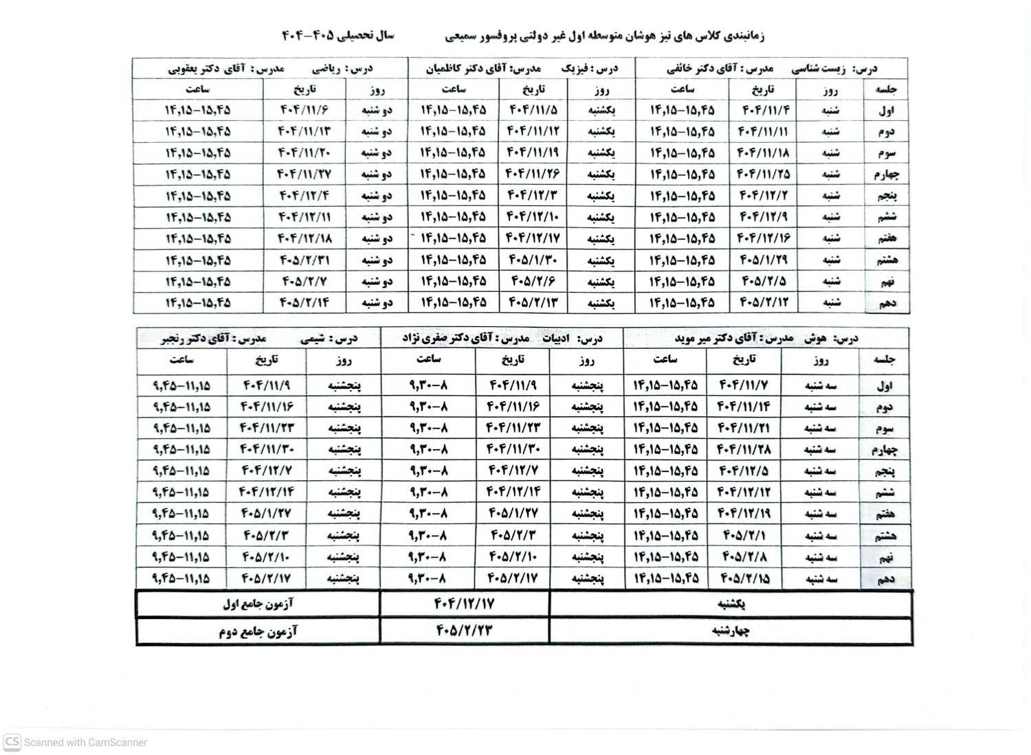 در ضمن کلاسهای تیز هوشان طبق برنامه اعلام شده از روز شنبه برگزار می شود فقط برنامه روزهای شنبه و یکشنبه بعد از امتحان تشکیل می شود و سایر دروس از روز دوشنبه بعد از ساعت آموزشی و بر اساس برنامه ادامه پیدا می کنند در ضمن دانش آموزانی که موفق به ثبت نام نشده اند می توانند به آقای جان اکبری مراجعه نمایند